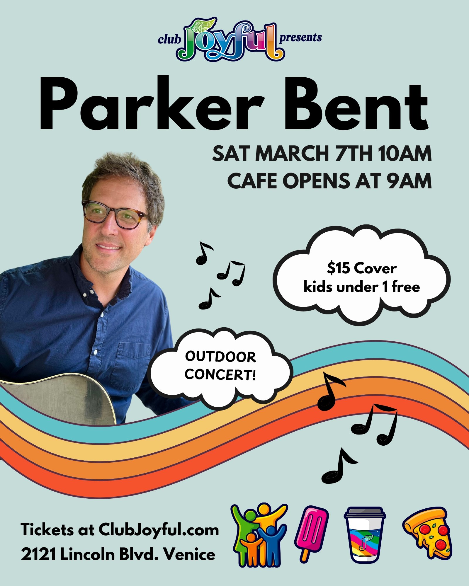 Parker Bent brings his original songs to over 450 kids every week throughout Los Angeles preschools. His music is smart, cool, sophisticated, and fun. It has been played on NPR and Disney Radio, has been recommended by LA Parent Magazine and was awarded the Bronze Medal by the Parents Choice Foundation.